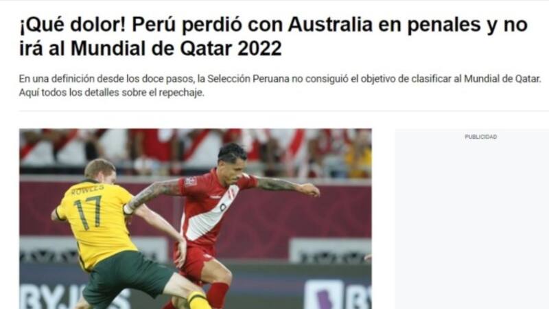 Por su parte, Depor escribía: “¡Qué dolor tan grande! La selección peruana perdió en penales frente a Australia, en el Ahmad Bin Ali Stadium de la ciudad de Rayán, y perdió la chance de llegar al Mundial de Qatar”, mientras que Líbero también expresaba tristeza en sus líneas. “Adiós a un sueño: Perú cayó en tanda de penales y quedó fuera de Qatar 2022″. La misma publicación indica que entre las claves de la derrota estuvieron el muy buen análisis que hizo Australia, un mediocampo impreciso y los cero remates que efectuó el equipo de Gareca en los 90 minutos.