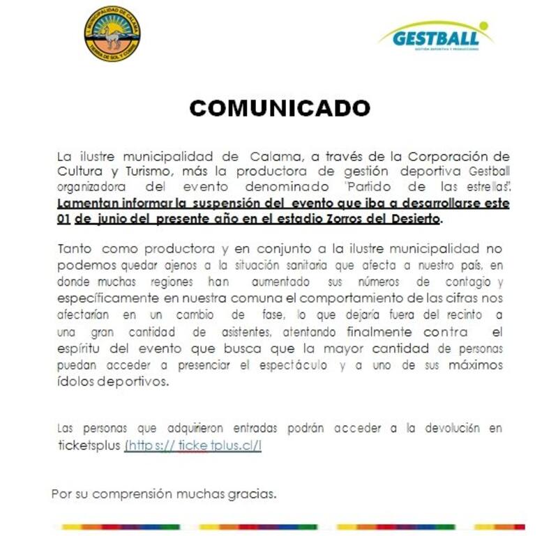 La Municipalidad de Calama y la productora a cargo de la organización (Gestball) comunicaron que este partido amistoso no se podrá disputar el próximo 1° de junio, en la Región de Antofagasta, arguyendo motivos sanitarios: el alza de casos de Covid-19 en la ciudad.