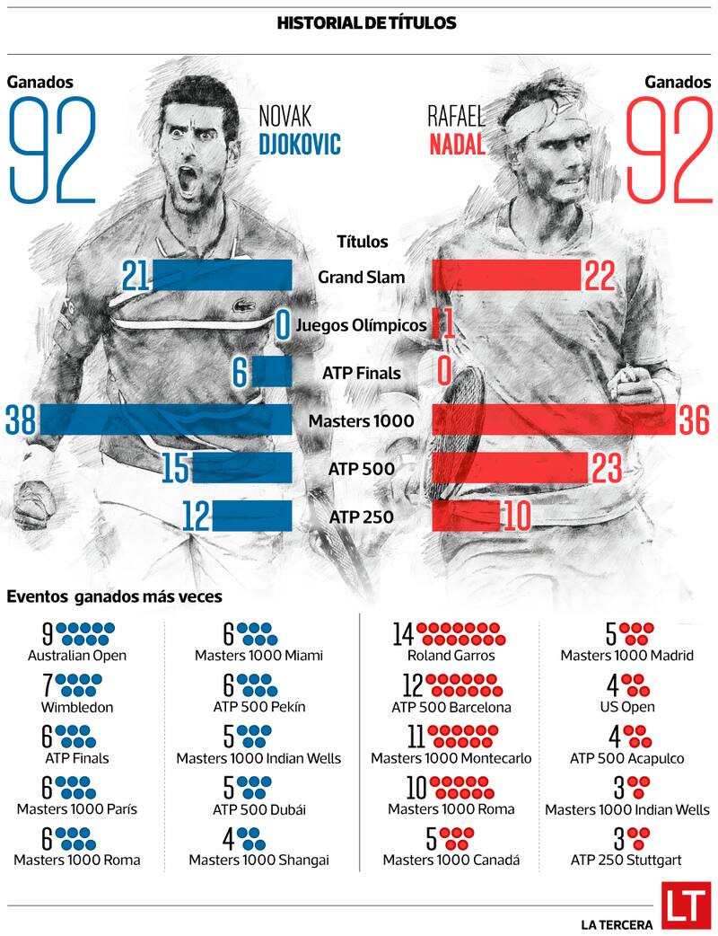 Si Nole consigue su vigésimo segundo Grand Slam y su 93º título como profesional quedará en lo más alto del tenis. Empatado con Nadal en grandes y superándolo en cantidad de títulos totales, Masters 1000 y ATP Finals, el serbio pasaría a ser el jugador activo más completo en cuanto a consagraciones.