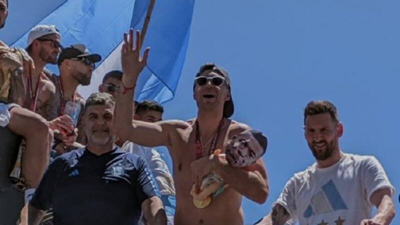 Fue allí, en el bus que los transportaba por la capital transandina, donde se pudo ver al meta del Aston Villa con un muñeco, que simbolizaba un recién nacido, con la cara de Kylian Mbappé. A torso descubierto y luciendo la medalla que lo acredita como monarca de Qatar 2022, Martínez no soltaba el juguete y cada cierto tiempo se llevaba su índice a la boca para pedir silencio.