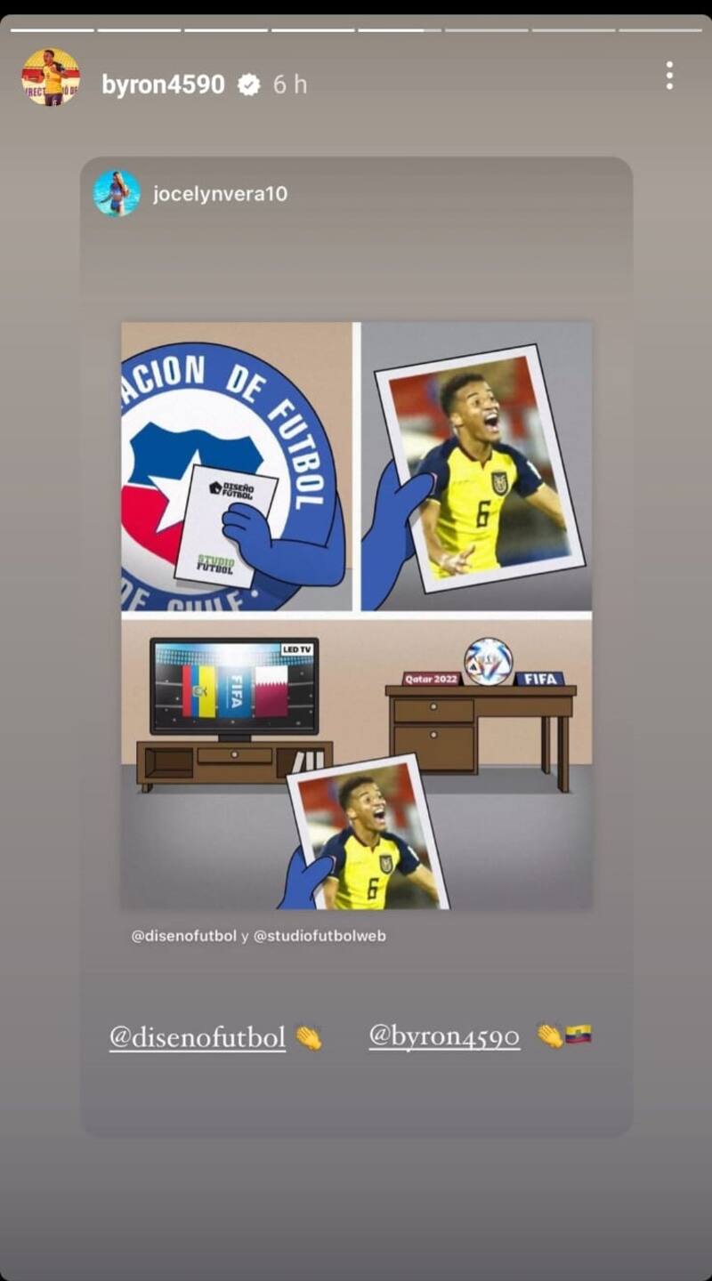 Además, en sus historias de Instagram, el futbolista del Barcelona de Guayaquil compartió imágenes en las que se le había etiquetado. La más polémica es la que muestra a la federación chilena mirando el partido inaugural (Qatar vs. Ecuador) por televisión. La foto fue publicada por la cuenta @diseñofutbol, y compartida por una periodista de ese país, quien mencionó a Castillo, que también la compartió en su cuenta.
