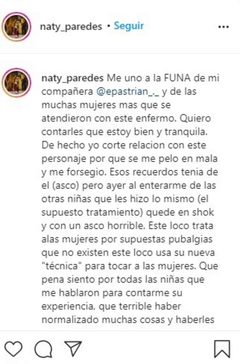 “Me uno a la FUNA de mi compañera @epastrian_._ y de las muchas mujeres más que se atendieron con este enfermo. Quiero contarles que estoy bien y tranquila. De hecho, yo corté relación con este personaje porque se me peló en mala y me forcejeó. Esos recuerdos tenía de él (asco), pero ayer al enterarme de las otras niñas (a las) que les hizo lo mismo (el supuesto tratamiento), quedé en shock y con un asco horrible. Este loco trata a las mujeres por supuestas pubalgias que no existen, este loco usa su nueva ‘técnica’ para tocar a las mujeres. Qué pena siento por todas las niñas que me hablaron para contarme su experiencia, qué terrible haber normalizado muchas cosas y haberles bajado el perfil. No te deseo el mal Ignacio. solo deseo que todas las niñas se atrevan a hablar para ayudar a alguien más, como Emi me ayudó a darme cuenta de que lo que pasé no fue algo no normal y que este tipo NO puede trabajar jamás con mujeres”, explica.
