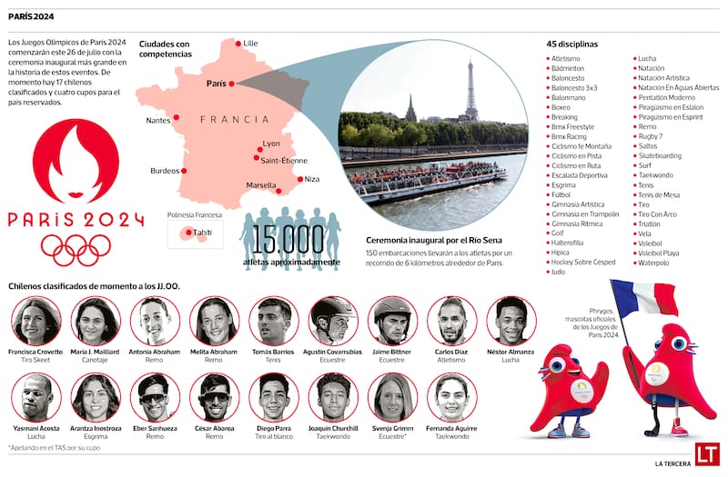Embarcaciones con atletas recorriendo el Sena, competencias ecuestres en el palacio de Versalles, vóleibol playa a los pies de la Torre Eiffel y el surf disputándose a más de 15.000 kilómetros de París, serán alguna de las postales que se verán durante el 26 de julio y el 11 de agosto en unos Juegos donde 17 chilenos ya tienen asegurada su presencia. El país, además, tiene cuatro cupos reservados para tres disciplinas.