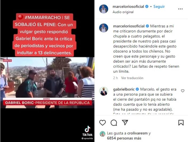 Ríos había condenado fuertemente la acción, basándose en un video. “Mientras a mi me criticaron duramente por decir chupala a cuatro pelagatos, el presidente de nuestro país pasa casi desapercibido haciéndole este gesto obsceno a todos los chilenos. No creen que este personaje y su gesto deben ser aún más duramente criticado!? Las faltas de respeto tienen un límite”, planteó, a través de su cuenta verificada. Obviamente, como cada una de sus acciones, despertó controversia.