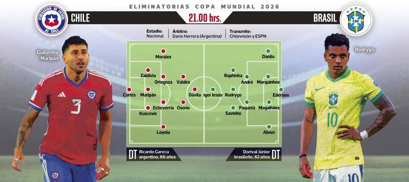 Chile y Brasil protagonizarán un partido de alta tensión. Para la Roja, por definición, enfrentar al pentacampeón del mundo representa un ejercicio de extrema complejidad, por más que en la retina aún permanezca un par de victorias notables. Hoy, el equipo de Ricardo Gareca no está para recuerdos. De hecho, los más cercanos que tiene son auténticas pesadillas. El equipo nacional viene de caer frente a Argentina y Bolivia en la fecha de septiembre. Los efectos se grafican en la tabla: está penúltimo, con solo cinco unidades. Solo supera a un Perú incluso más complicado. Estados Unidos, México y Canadá se ven incluso más allá que lo que los muestra el mapa.