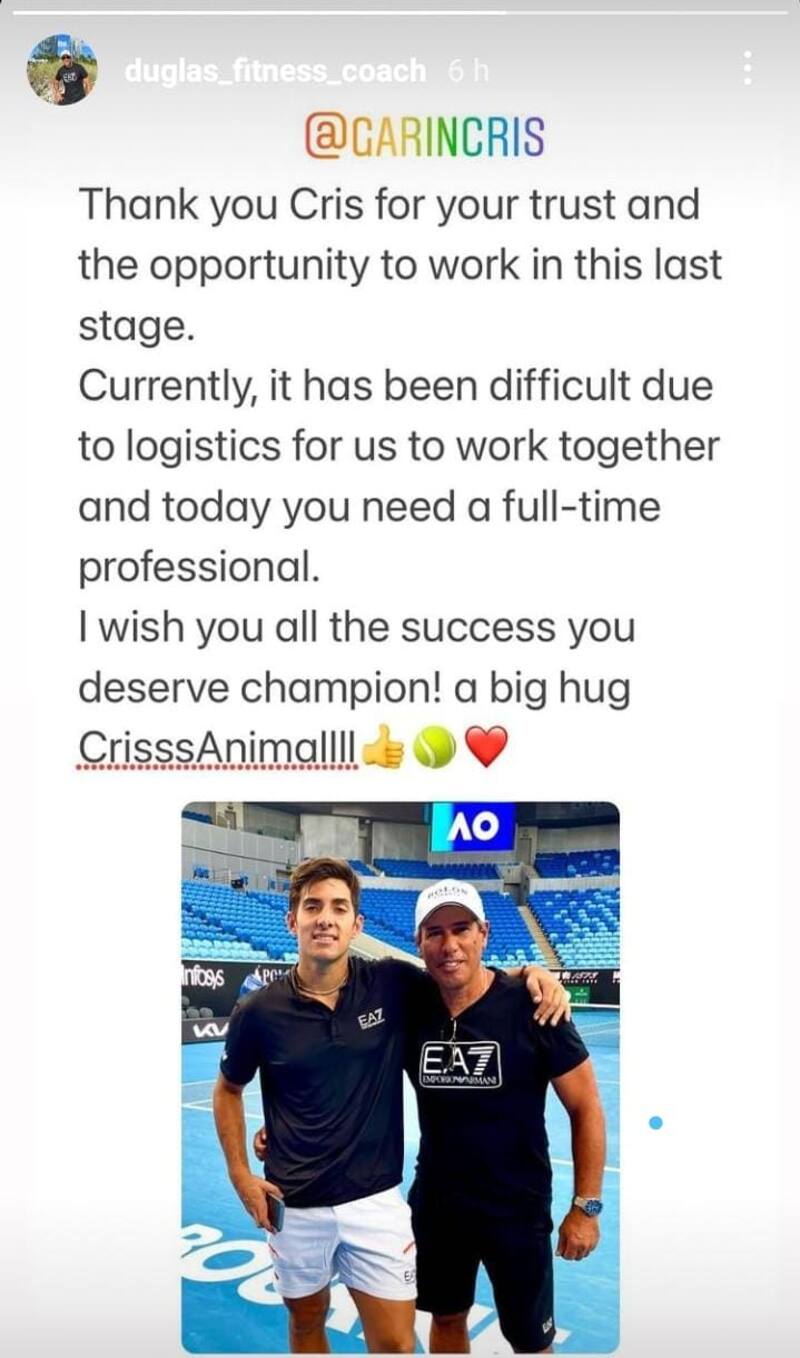 A horas del debut, el cubano Duglas Cordero, preparador físico de Garin, anunció el término de su vínculo con el chileno. Las principales razones para esta decisión apuntan a la distancia, ya que el PF tiene su centro de operaciones en Miami. “Gracias Cris por tu confianza y la oportunidad de trabajar en esta última etapa. Actualmente ha sido difícil por logística trabajar juntos y hoy se necesita un profesional a tiempo completo. ¡Te deseo todo el éxito que te mereces campeón! Un fuerte abrazo, CrissAnimallll”, escribió en una historia de Instagram.
