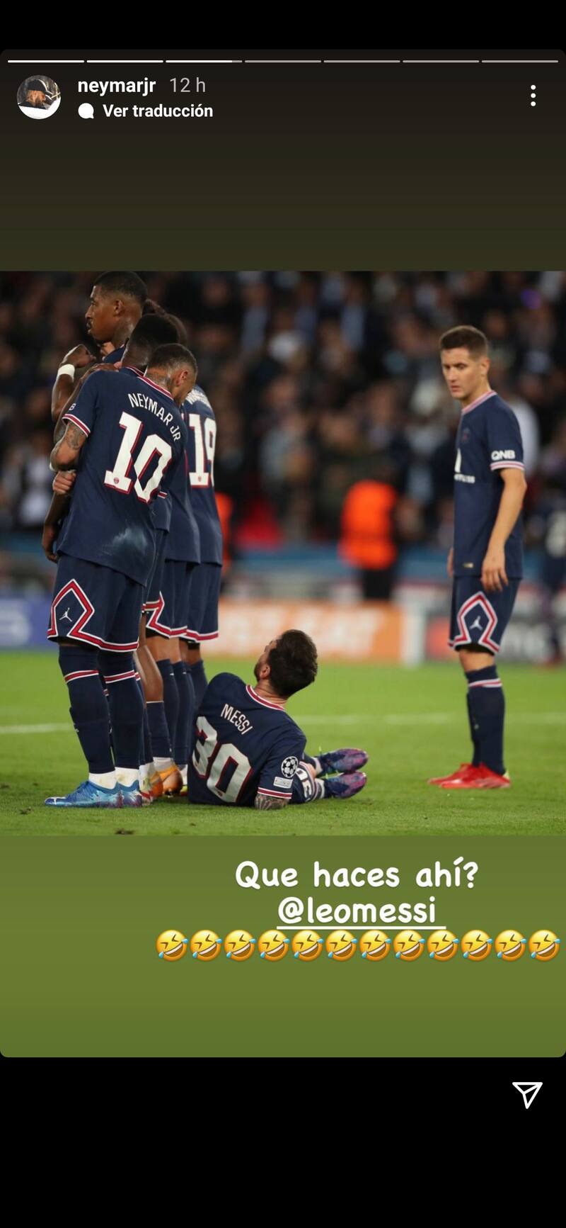 “¿Qué haces ahí?”, escribió el brasileño en una de sus historias de Instagram con una imagen en la que se ve al 10 mirando a Messi en el suelo”.