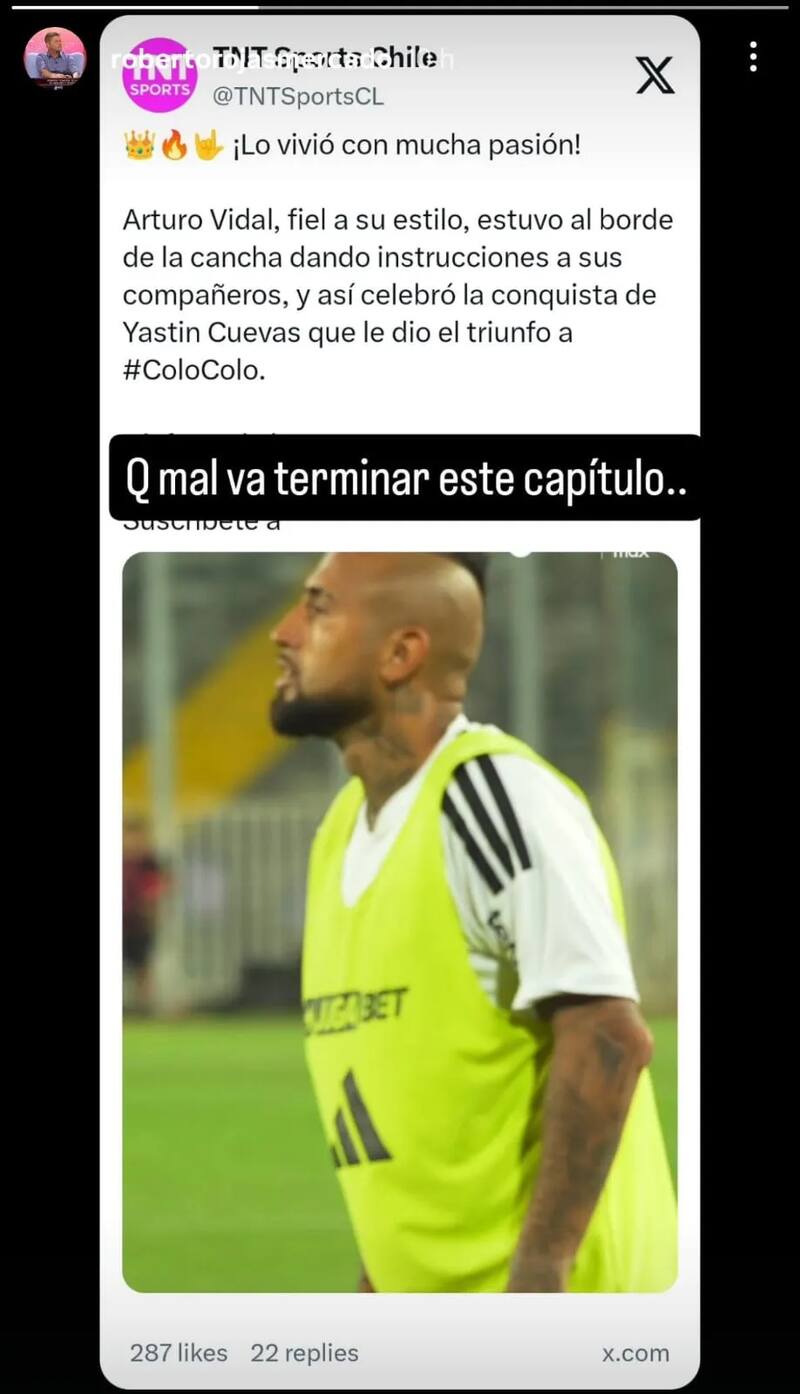 Este acto recibió una serie de comentarios. Uno de ellos vino del exfutbolista y entrenador Roberto Rojas. El Tomatín ocupó sus redes sociales para compartir una publicación en la que se resalaba cómo vivió Vidal los minutos finales del encuentro contra los ruleteros, acompañándola con el mensaje “qué mal va a terminar este capítulo...”.