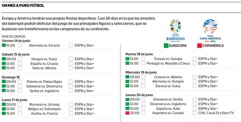 El torneo europeo de selecciones, que se disputa en Alemania, arrancó este viernes y finalizará el 14 de julio, en Berlín. Ese mismo día, en Miami, se disputará la final del certamen americano que se llevará a cabo en Estados Unidos.