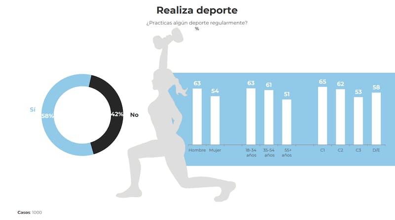 Para la realización del informe, se consideró un universo de mil encuestados y se llevó a cabo en febrero de 2025. De ellos, un 58% aseguró practicar algún deporte regularmente, contra un 42% de negativa, representando un alto porcentaje de sedentarismo. Dentro de las afirmaciones, un 63% eran hombres y un 54% mujeres. En cuanto al rango etario, un 63% tenía entre 18 y 24 años, un 61% entre 35 y 54, y un 51% más de 55.