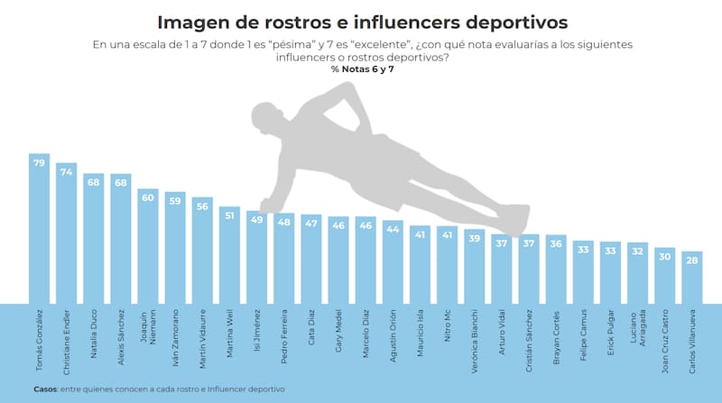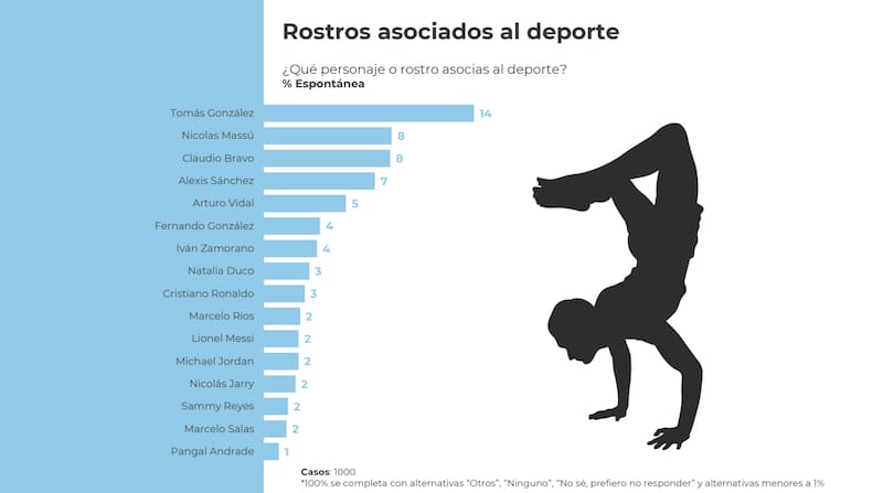 Pese a la preferencia por el fútbol, los rostros más asociados al deporte provinieron de otras disciplinas. Por ejemplo, Tomás González (14) fue el más mencionado, seguido por Nicolás Massú (8). Ahí recién emergieron futbolistas como Claudio Bravo (8), Alexis Sánchez (7) y Arturo Vidal (5).