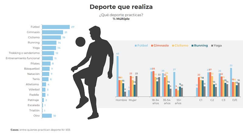 En ese sentido, el fútbol continúa siendo el deporte más popular, con un 27%. Es seguido por el gimnasio (21%), ciclismo (19%), running y yoga (ambos con 14%). Más atrás aparecen trekking o senderismo (12%), entrenamiento funcional (11%), pilates (8%), básquetbol (7%) o natación (7%).