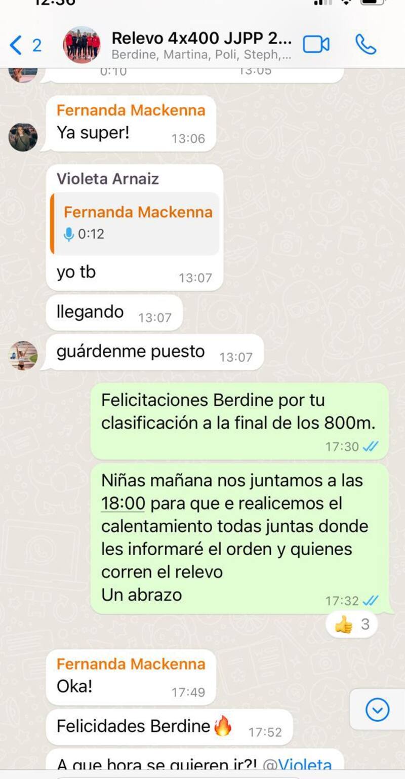 Dos minutos después, el siguiente: “Niñas mañana nos juntamos a las 18.00 para que realicemos el calentamiento todas juntas donde les informaré el orden y quienes corren el relevo. Un abrazo”. Ambos mensajes aparecen como leído por todos los participantes del grupo y en el caso del segundo, tres de las atletas reaccionaron con un emoji de pulgar hacia arriba.
