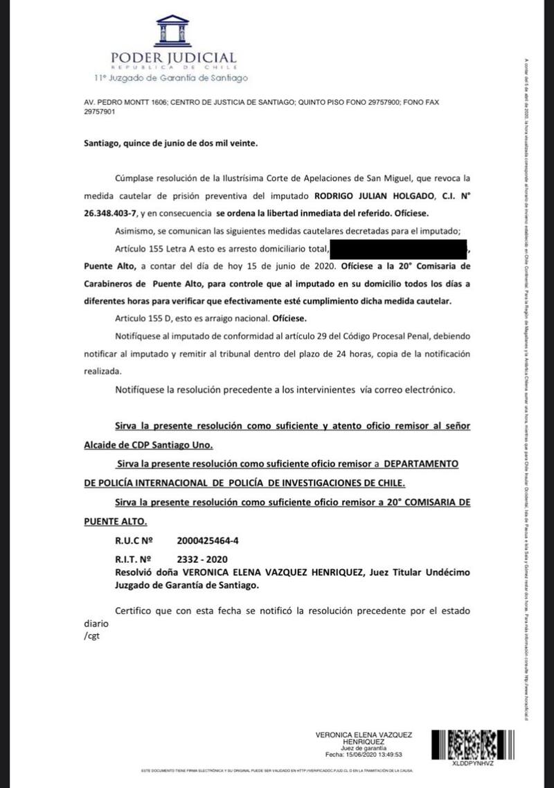 Rodrigo Holgado deja la cárcel y pasa a arresto domiciliario
