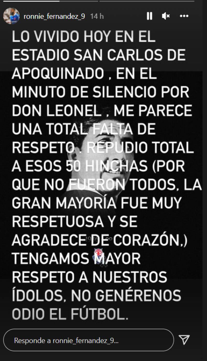 “Lo vivido hoy en el estadio San Carlos de Apoquindo, en el minuto de silencio por Don Leonel, me parece una total falta de respeto. Repudio total a esos 50 hinchas (porque no fueron todos. La gran mayoría fue muy respetuosa y se agradece de corazón). Tengamos mayor respeto por nuestros ídolos. No generemos odio en el fútbol”, manifestó el delantero de los laicos.