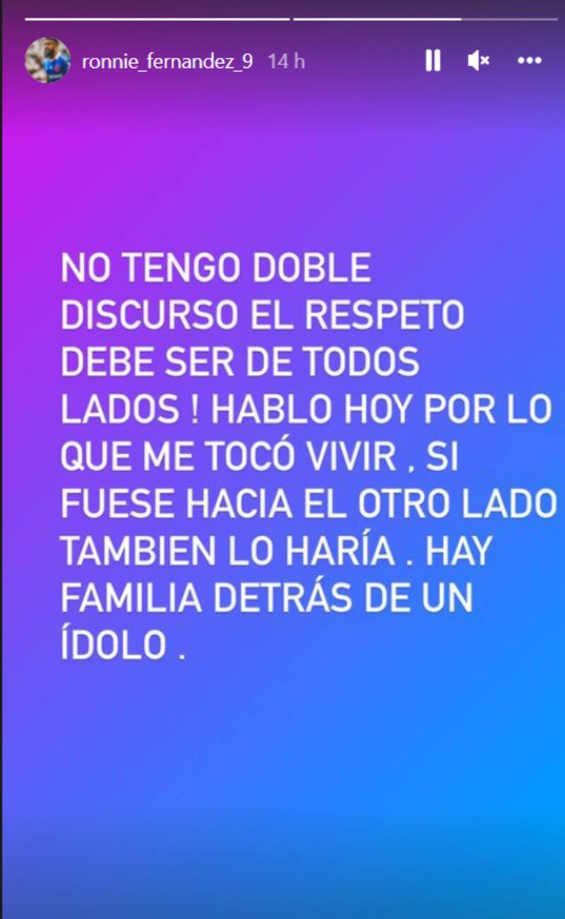 “No tengo doble discurso. El respeto debe ser de todos lados. Hablo hoy por lo que me tocó vivir. Si fuese hacia el otro lado también lo haría. Hay una familia detrás de un ídolo”, complementó el ariete.