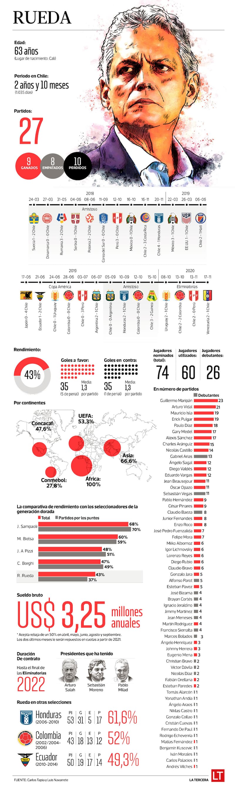 El lunes 8 de enero de 2018, Reinaldo Rueda se transformó en el nuevo director técnico de la selección chilena. El colombiano llegó con la misión de reconstruir a un equipo hundido por el ego y las divisiones internas, además de la amenaza del vencimiento natural de la generación dorada, que había llevado a la Roja a dos mundiales y a ganar las primeras dos Copa América de su historia. Si bien a su llegada prometió “conservar un ADN de fútbol atractivo y vistoso”, en la práctica muy poco de eso se ha visto y la derrota del martes ante Venezuela pone su proceso en serio entredicho después de haber dejado una sensación más que aceptable en el arranque eliminatorio.