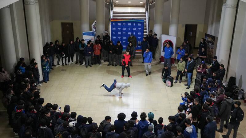 La Corporación Santiago 2023 sigue buscando instancias para conectar las disciplinas menos conocidas de estos Juegos con la comunidad. Hoy fue el turno del breaking, modalidad que debuta en la competencia y que tuvo a sus exponentes en el Liceo Nacional Barros Arana.
