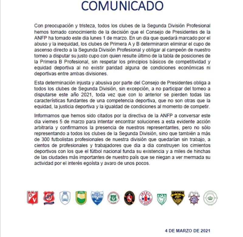 “Con preocupación y tristeza, todos los clubes de la Segunda División Profesional hemos tomado conocimiento de la decisión que el Consejo de Presidentes de la ANFP ha tomado este día lunes 1 de marzo. En un día que quedará marcado por el abuso y la inequidad, los clubes de Primera A y B determinaron eliminar el cupo de ascenso directo a la Segunda División Profesional y obligar al campeón de nuestro torneo a disputar su justo cupo con quien resulte último (penúltimo) de la tabla de posiciones de la Primera B Profesional, sin respetar los principios básicos de competitividad y equidad deportiva al no existir paridad alguna de condiciones económicas ni deportivas entre ambas divisiones”, parte el escrito.