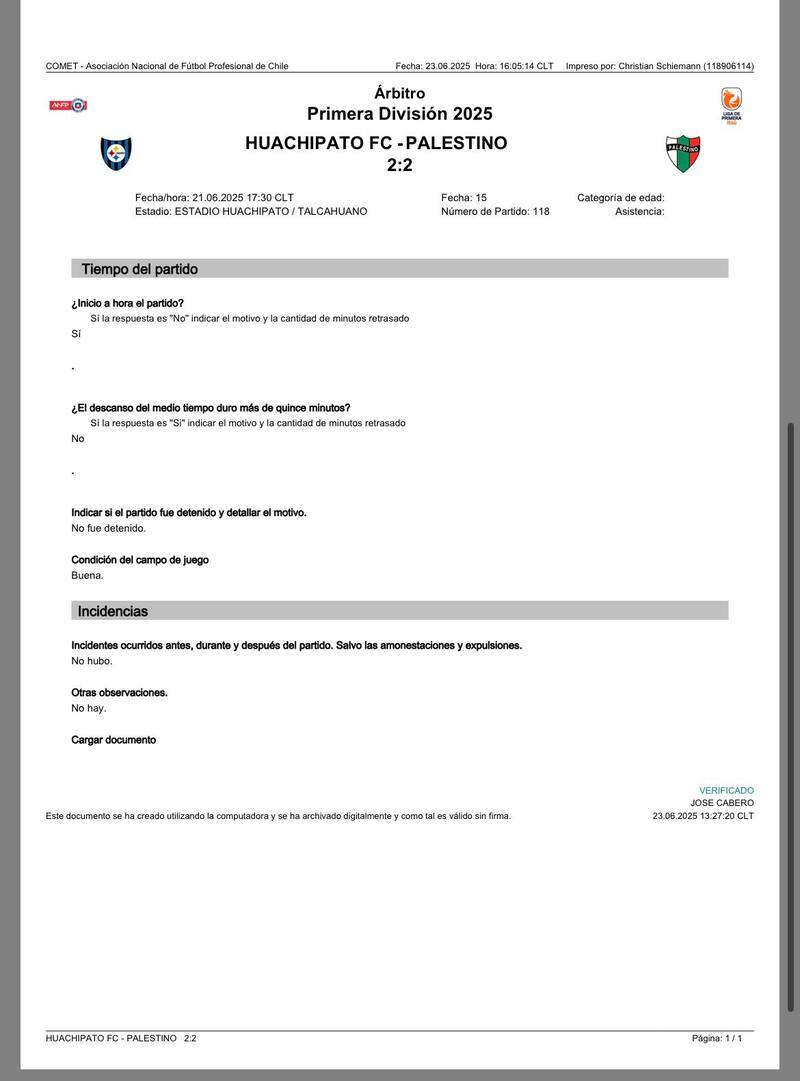 Lo más llamativo, en todo caso, es un concepto que Cabero ocupa en el informe que debe emitir a las autoridades del fútbol respecto de las condiciones del campo de juego. El árbitro ocupó la calificación ‘buena’ para referirse al estado del piso. No incluyó ninguna observación adicional y tampoco ocupó concepto alguno para consignar alguna irregularidad.
