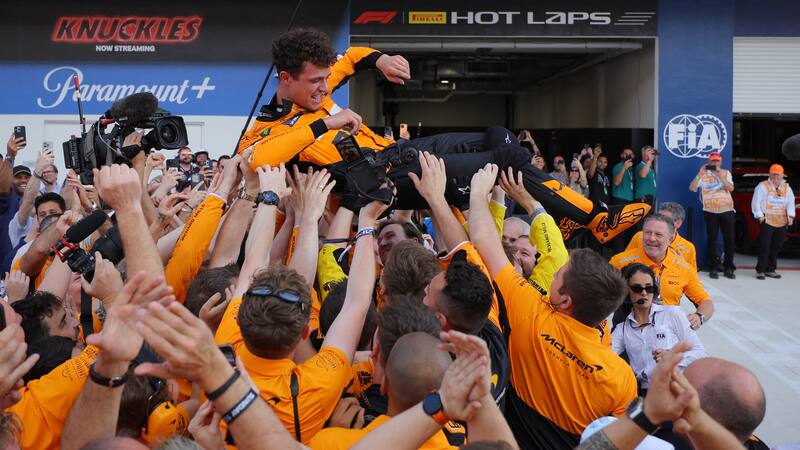 Lando Norris escribe su propia historia en la Fórmula 1. El piloto británico gana por primera vez una carrera en la máxima categoría del automovilismo. Lo hace, además, cortando la hegemonía de Max Verstappen, quien se ha impuesto cuatro de los seis GP que van en la temporada. Luego de su triunfo, el nacido en Bristol fue levantado en andas por sus compañeros de McLaren.