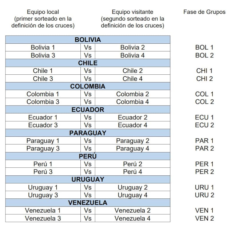 La posición en la tabla de posiciones de la liga local no influye para el armado de las parejas. Por lo tanto, el primer sorteado de cada país será el local, mientras que el segundo sorteado será el visitante. Los ganadores de cada una de las llaves se meterán en la fase grupal de la Sudamericana.