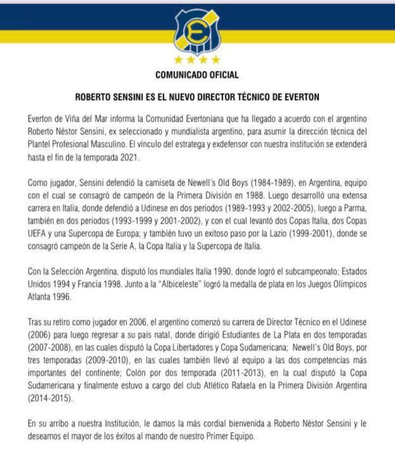 “Everton de Viña del Mar informa la Comunidad Evertoniana que ha llegado a acuerdo con el argentino Roberto Néstor Sensini, ex seleccionado y mundialista argentino, para asumir la dirección técnica del Plantel Profesional Masculino. El vínculo del estratega y exdefensor con nuestra institución se extenderá hasta el fin de la temporada 2021″, comunicó el club esta mañana, de forma oficial.