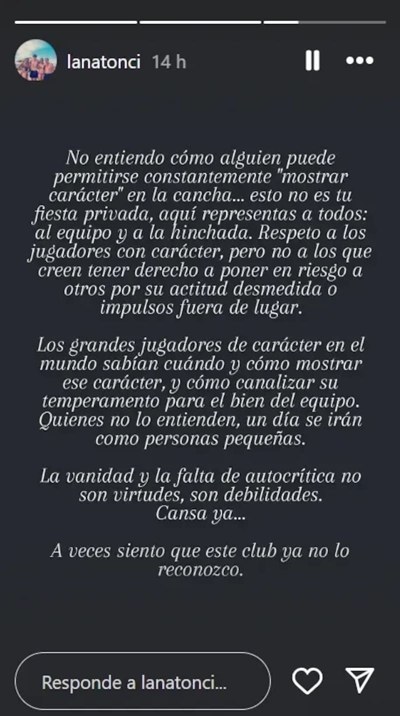 “No entiendo cómo alguien puede permitirse constantemente ‘mostrar carácter’ en la cancha… esto no es tu fiesta privada, aquí representas a todos: al equipo y a la hinchada”, escribió de inició en su cuenta de Instagram.