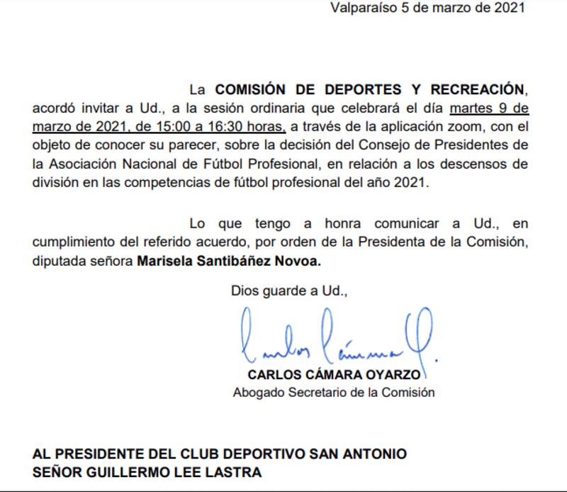 Por otro lado, la Cámara de Diputados se puso en contacto con el presidente de San Antonio Unido, Guillermo Lee, con el fin de coordinar una reunión para el martes a las 15.00 horas. A través de una llamada telefónica efectuada por la diputada Marisela Santibáñez, quien es presidenta de la Comisión de Deportes y Recreación, la entidad política se mostró dispuesta a escuchar la problemática que afecta a la tercera categoría del fútbol chileno y analizar de qué manera podrían intervenir. Posteriormente, les enviaron la citación formal.