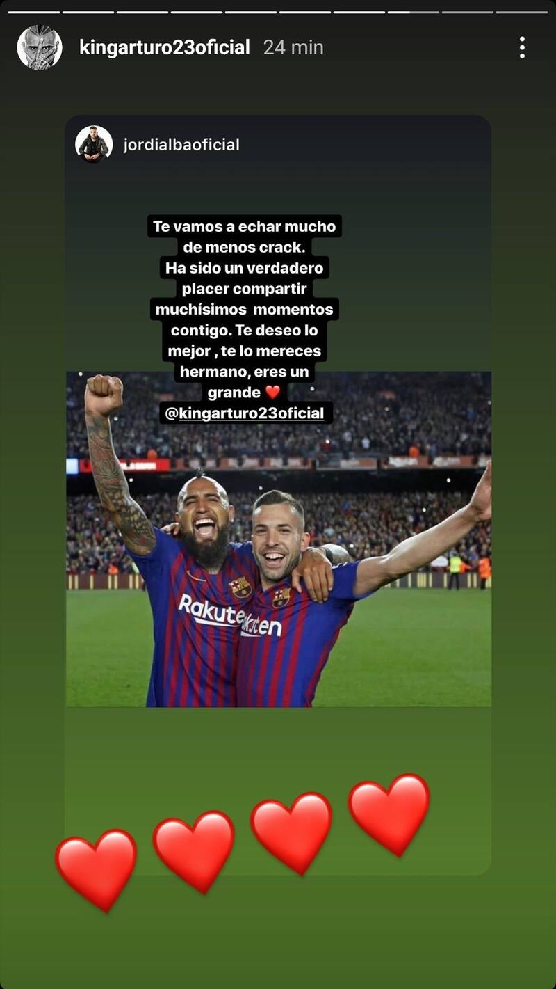 Jordi Alba, lateral azulgrana, también se despidió del mediocampista a través de Instagram. "Te vamos a echar mucho de menos crack. Ha sido un verdadero placer compartir muchísimos momentos contigo. Te deseo lo mejor, te lo mereces hermano, eres un grande”, expresó el español. Vidal compartió la publicación en su cuenta de la misma red social.