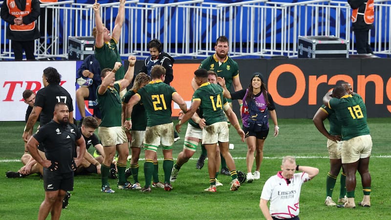 A Nueva Zelanda las cosas no le salían. A 7′ del cierre, erraban un penal que lo pudo haber puesto arriba. En ese momento ambos elencos estaban con 14 deportistas en el campo de juego. Cheslin Kolbe abandonaba entre lágrimas tras recibir tarjeta amarilla. Para los dirigidos por Ian Foster el reloj volaba. Para los africanos estaba detenido. La escasa diferencia se hacía notar con la tensión de que existía en Francia.