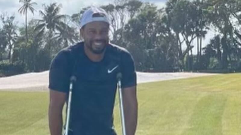 Tiger Woods reaparece sonriente y con muletas a dos meses de su accidente automovilístico