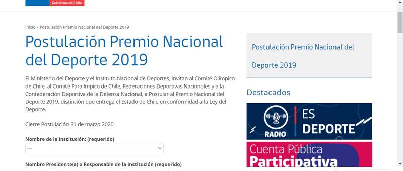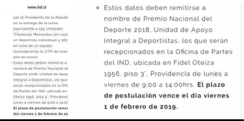 En el caso del deporte blanco, a sus oficinas llegó el oficio enviado por el Ministerio del Deporte invitando a postular a sus más destacados representantes al Premio Nacional. El Mindep envió, por correo certificado, esas cartas a las 15 federaciones, el COCh y el resto de las instituciones que corresponde antes del 20 de febrero.