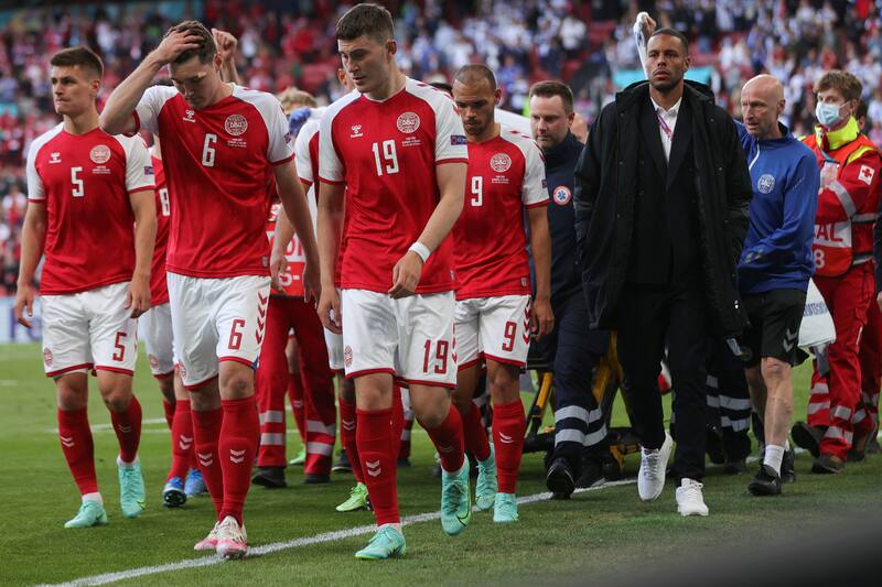 Cerca del final del primer tiempo, el futbolista del Inter de Milán se desmayó tras ir a buscar una pelota larga. Los paramédicos ingresaron al campo y tuvieron que realizarse reanimación cardiopulmonar. Eriksen fue retirado del campo en camilla, consciente y con oxígeno. El jugador se encuentra estable y despierto. La UEFA suspendió el partido, pero tras conocerse el estado de salud del volante, ambas selecciones decidieron, de forma voluntaria, reanudar el compromiso.