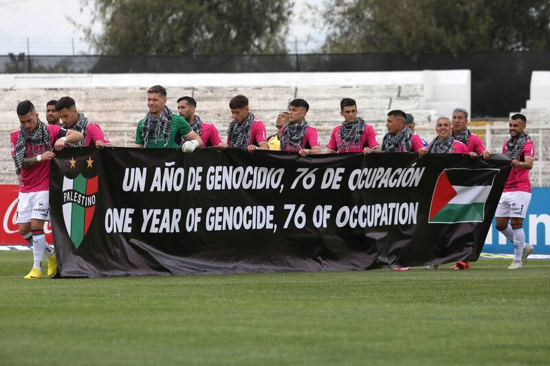 A propósito del mencionado partido, Palestino salió con esta pancarta a la cancha:
