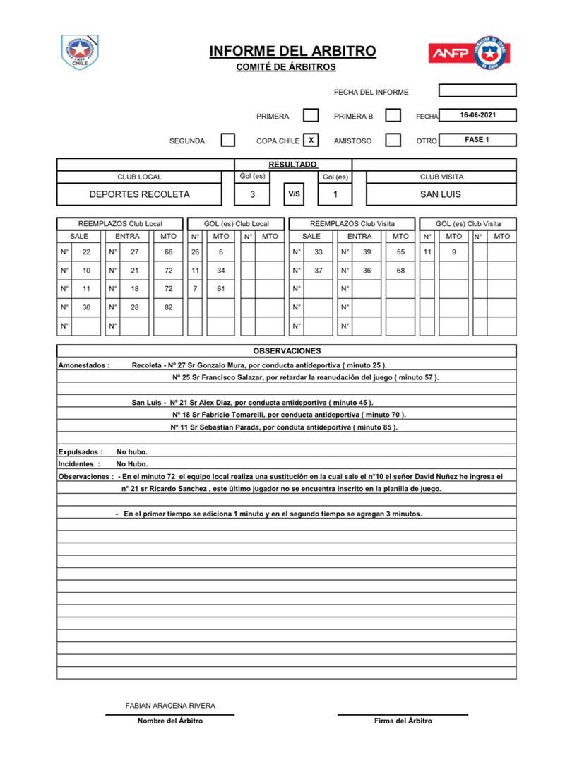 Poco pudieron hacer en Recoleta frente a la denuncia interpuesta durante la semana pasada. Es que el informe del juez Fabián Aracena, el encargado de llevar adelante el duelo entre los capitalinos y los de la Quinta Región, fue clave. El árbitro acusó al elenco de Núñez de hacer jugar a un futbolista que no estaba inscrito en la planilla. “En el minuto 72 el equipo local realiza una sustitición en la cual sale el N 10 el señor David Núñez e ingresa el n 21 Ricardo Sánchez, este último jugador no se encuentra inscrito en la planilla de juego”, dice el escrito del árbitro.