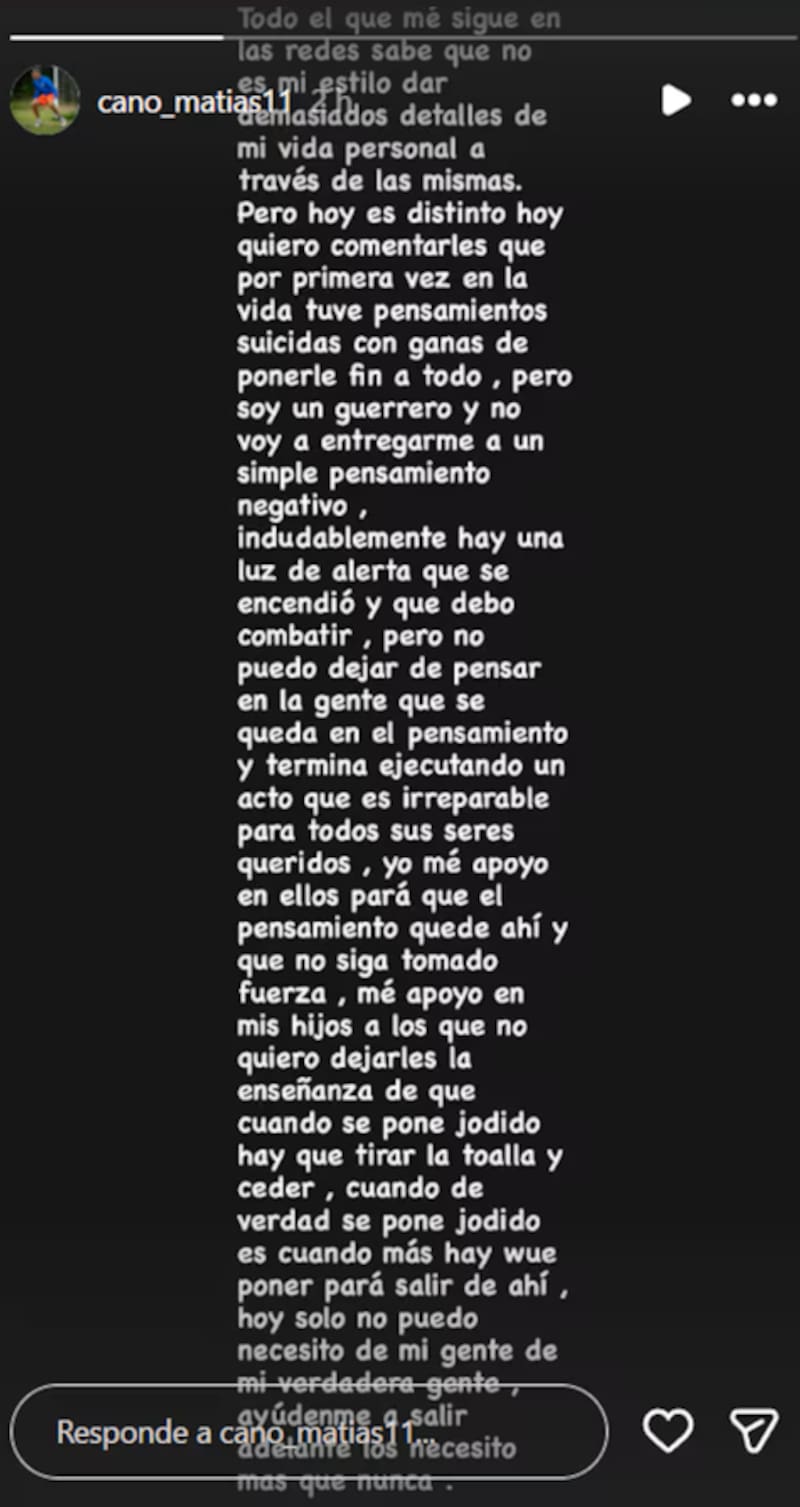 Pese a la complejidad del mensaje, Matías Cano manifestó que está luchando para salir adelante, apoyado en su familia. “Me apoyo en mis hijos, a los que no quiero dejarles la enseñanza de que cuando se pone jodido hay que tirar la toalla y ceder. Cuando de verdad se pone duro es cuando más hay que esforzarse para salir. Hoy solo no puedo, necesito de mi gente, de mi verdadera gente. Ayúdenme a salir adelante, los necesito más que nunca”, cerró el golero transandino, de recordado paso por el fútbol nacional.