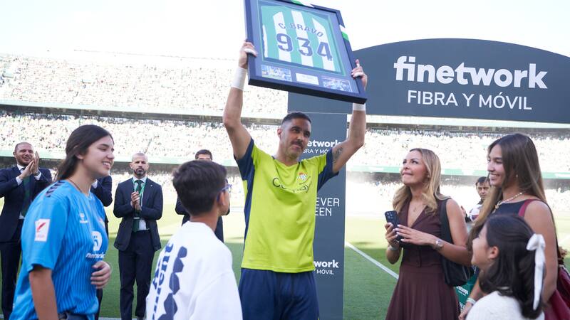 Ya en el terreno de juego, se ve el calentamiento de Bravo y los homenajes que recibió, en los que fue acompañado por su familia. Además del pasillo de honor, se aprecia una camiseta enmarcada como el jugador 934 en la historia del Betis.