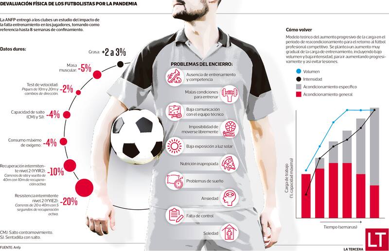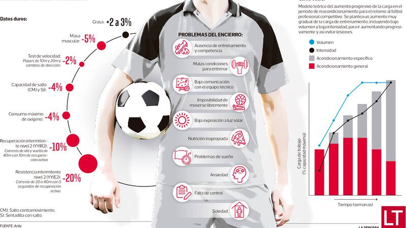Las consecuencias estarán a la mano. “El aislamiento tendrá un impacto en el estado físico y mental de los futbolistas (...) Estos cambios resultarán en un rendimiento físico disminuido y un riesgo de lesiones aumentado”, indica el documento entregado a los equipos y que manifiesta devaluaciones de rendimiento de velocidad, resistencia y masa muscular, entre otros factores, como señala esta infografía.