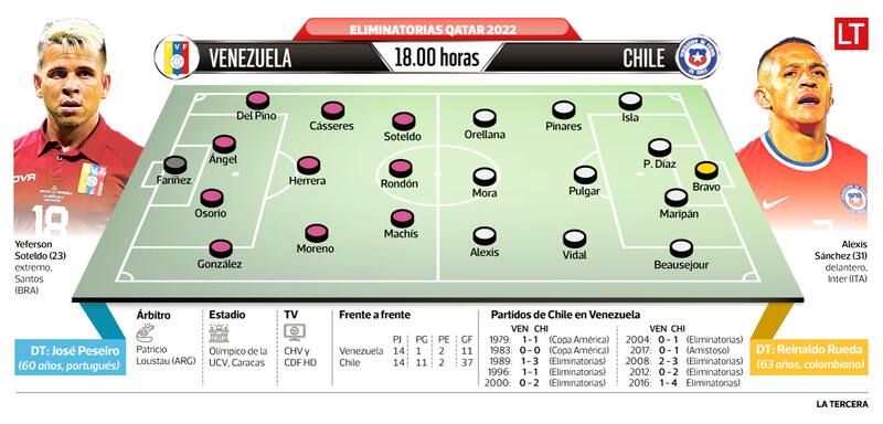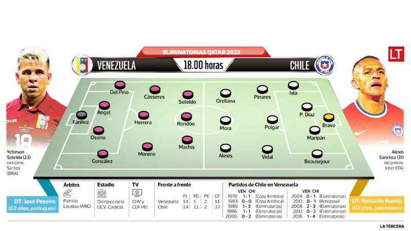 La Roja juega obligada a mantener una marca histórica: no ha perdido nunca en Venezuela. Por Eliminatorias, solo empató en el 97 y le costó el puesto a Azkargorta. Con Alexis ya en el once titular, el equipo de Rueda tiene la misión de hacer valer la jerarquía y de recuperar los puntos perdidos de local ante Colombia.