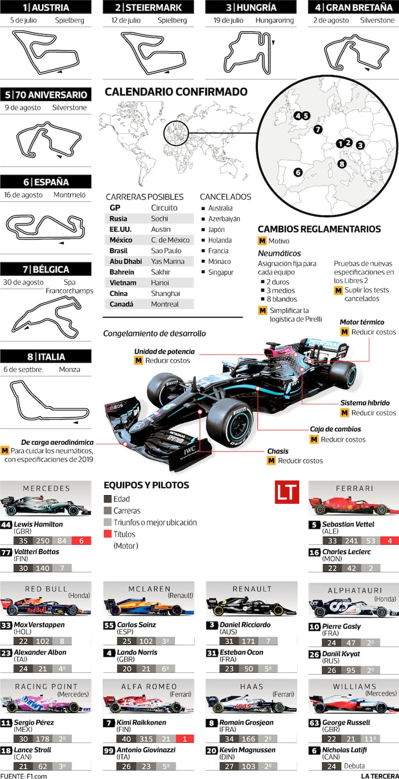 Este fin de semana se inicia por fin la temporada 2020 de la Fórmula Uno, después de 16 semanas de suspensión. Partirá en Austria con un calendario donde solo se sabe cuáles serán las primeras ocho carreras, todas en Europa, y con la novedad de dos fechas dobles, la primera de ellas en el mismo Red Bull Ring.