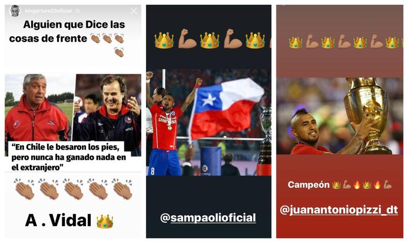 Al respecto, Vidal se manifestó en su cuenta de Instagram, apoyando las palabras de Sulantay y agregando impágenes con las cuentas de los técnicos campeones de América, Jorge Sampaoli y Juan Antonio Pizzi.