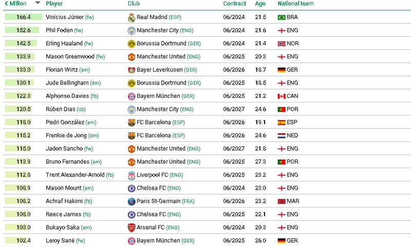 La lista es encabezada por el brasileño Vinicius Jr. El atacante del Real Madrid está tasado en 166.4 millones de euros. En segundo lugar está ubicado Phil Foden. El volante del Manchester City tiene una valoración de 152.6 millones.