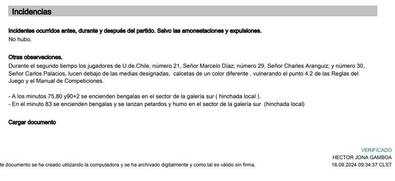 “Durante el segundo tiempo los jugadores de U. de Chile, número 21, Señor Marcelo Díaz; número 29, Señor Charles Aranguiz; y número 30, señor Cristian Palacios lucen debajo de las medias designadas calcetas de un color diferente vulnerando el punto 4.2 de las Reglas del Juego y el Manual de Competiciones”, detalló el silbante. Además, el juez consignó que hinchas de la U apostados en la galería encendieron bengalas en los minutos 75, 80 y 92, junto con realizar lanzamiento de petardos y humo, cuando el cronómetro marcaba 83′.