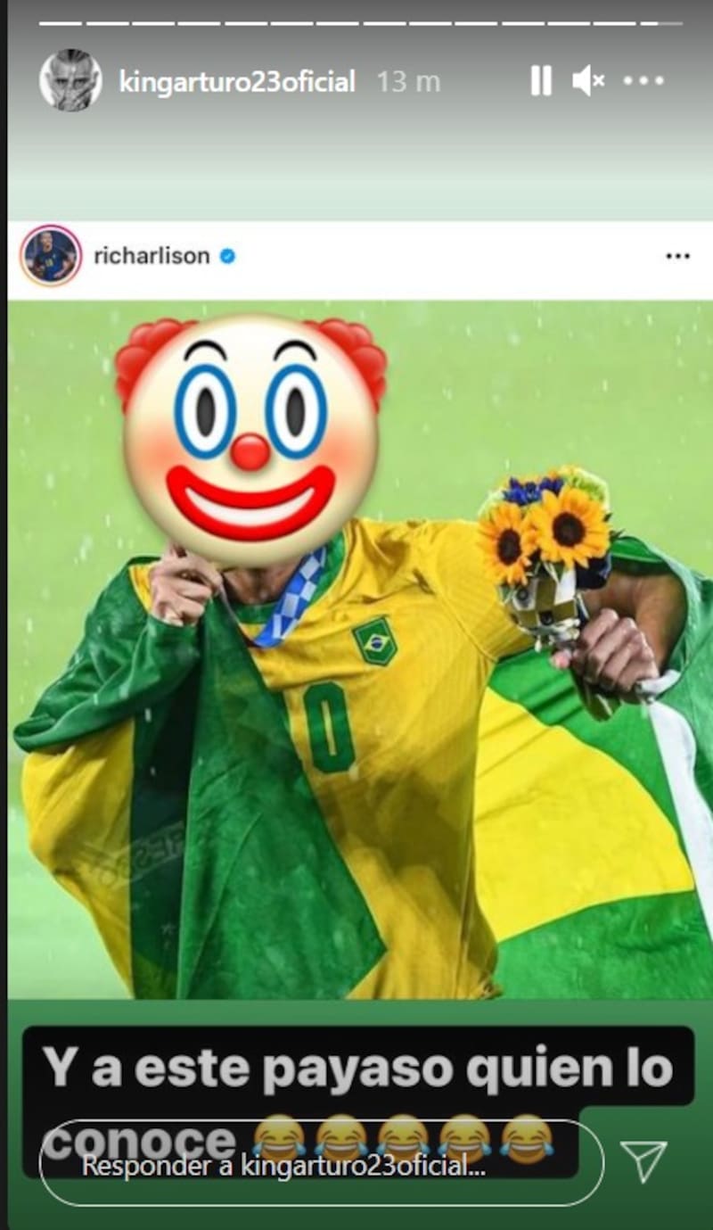 “¿Y a este payaso quien lo conoce”, disparó el mediocampista. En esa misma historia, subió el rostro de Richarlison con un emoticón de la figura circense y acompañando carcajadas para enfatizar su reacción.