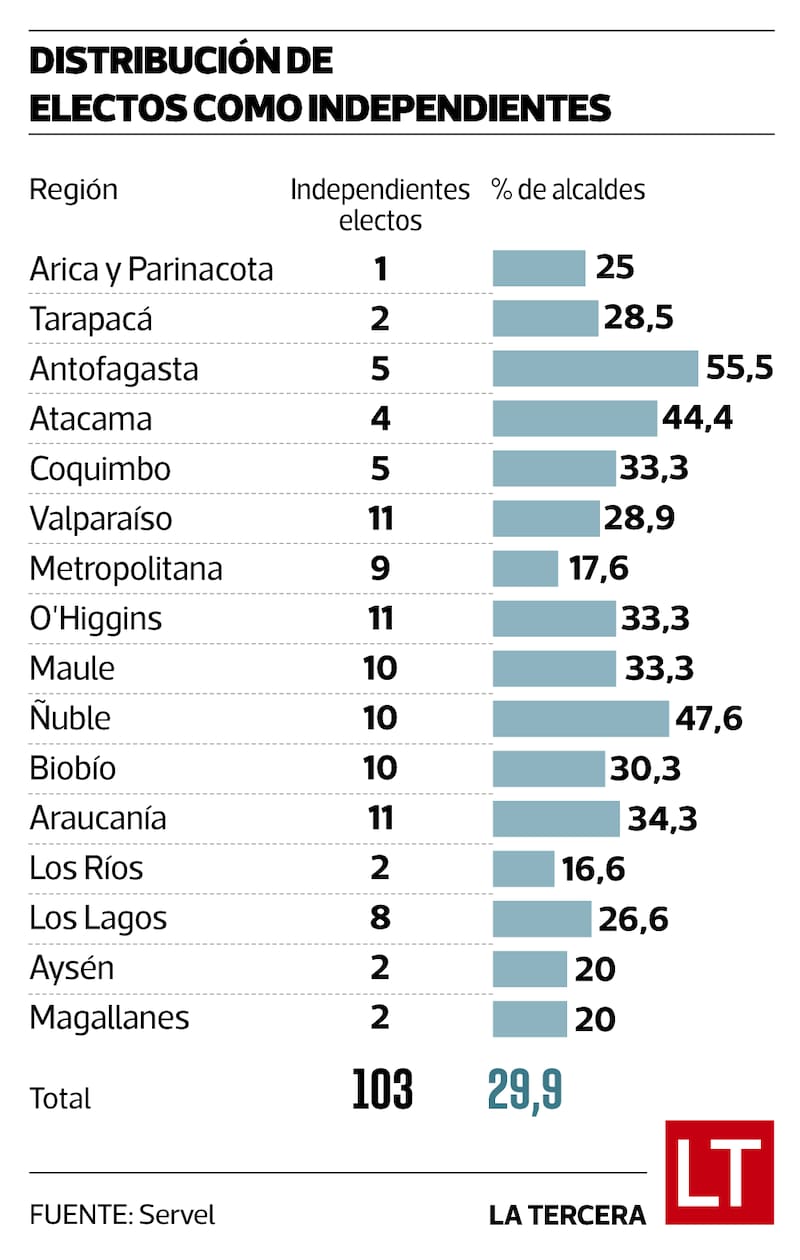 Según las estadísticas que arrojaron las recientes elecciones municipales, 103 fueron los alcaldes electos que hicieron candidaturas independientes y fuera de pacto. La cifra llamó la atención de inmediato, instalándose la idea de un cierto descontento con la política tradicional, porque ese poco más de centenar de ediles aparentemente independientes se acercaron en fuerza a los 111 alcaldes que logró Contigo Chile Mejor (AH, FREVS, FA, PC, PL, PPD, PR, PS y PDC) y los 122 que alcanzó Chile Vamos (UDI, RN y Evópoli).