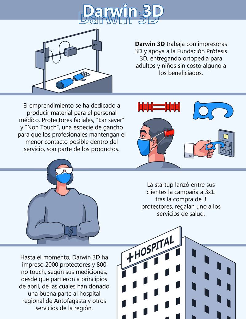 El primer emprendimiento de Cristian Zepeda (38), fundador de 3D Darwin, fue a los ocho años. Estudiante de un colegio jesuita católico, veía la serie animada Robotech y durante la emisión del programa armaba origamis de los clásicos personajes japoneses, los cuales vendía a sus compañeros durante los recreos. Este antofagastino, ingeniero civil en computación, en su ciudad natal decidió armar un negocio en 2017, cuando compró su primera impresora 3D, inspirado en un programa de televisión donde la usaban para modelar una prótesis de mano. Así tomó contacto con la Fundación Prótesis 3D, y comenzó a generar ortopedia para adultos y niños sin costo alguno a los beneficiados. En esa época, los aportes salían del bolsillo de Zepeda y su emprendimiento –Darwin 3D– nació para pagar los gastos y la operación que significaba realizar dichas prótesis. La contingencia del 2020 llevó a Zepeda a dirigir todos sus recursos a la fabricación de elementos de protección personal y prevención del contagio del Covid-19 para los profesionales de la salud. Asimismo, decidió fabricar los clásicos escudos faciales, que son acompañados por “Ear saver“ o protectores de oreja. Además de los “Non Touch”, una especie de gancho para que el médico o enfermero mantenga el menor contacto posible dentro del servicio. Contribuir en esta área no ha sido fácil. Al principio, tardaban cerca de 4 horas en terminar un protector facial y, tras optimizar el trabajo de las máquinas, lograron sacar un protector cada 25 minutos, llegando a tener una capacidad de 16 mil productos mensuales. Hasta el momento, Darwin 3D ha impreso 2000 protectores y 800 no touch, según sus mediciones, desde que partieron a principios de abril, de las cuales han donado una buena parte al hospital regional de Antofagasta, levantando la campaña 3x1: por la compra de tres protectores, regalan uno.