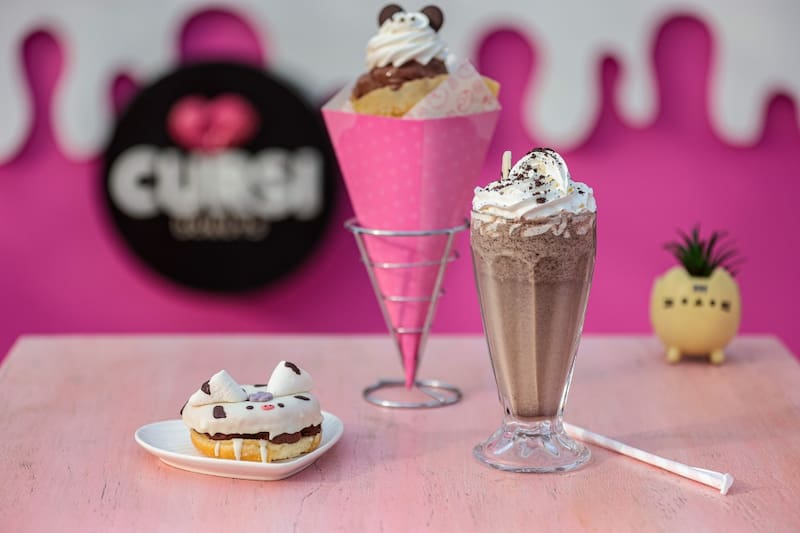 Mientras que los salones interiores tambien están llenos de detalles coloridos, como murales de gatitos, en tonos rosales y pastel, neones, cojines con forma de donas y hasta columpios que reemplazan a las sillas.