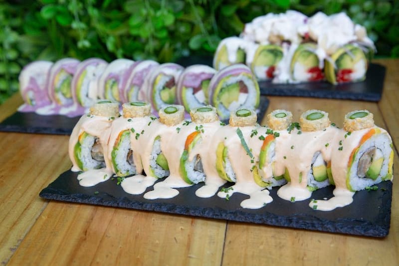 Y, lo que distingue a este sushi vegano, es la calidad, rico, bien hecho y con combinaciones muy originales. Prueba el Acevichado Parrillero ($ 6.500), con Vegadelphia, champiñón furai, ciboulette envuelto en palta, cubierto con palta o queso crema flambeado bañado, en salsa acevichada parrillera vegana.