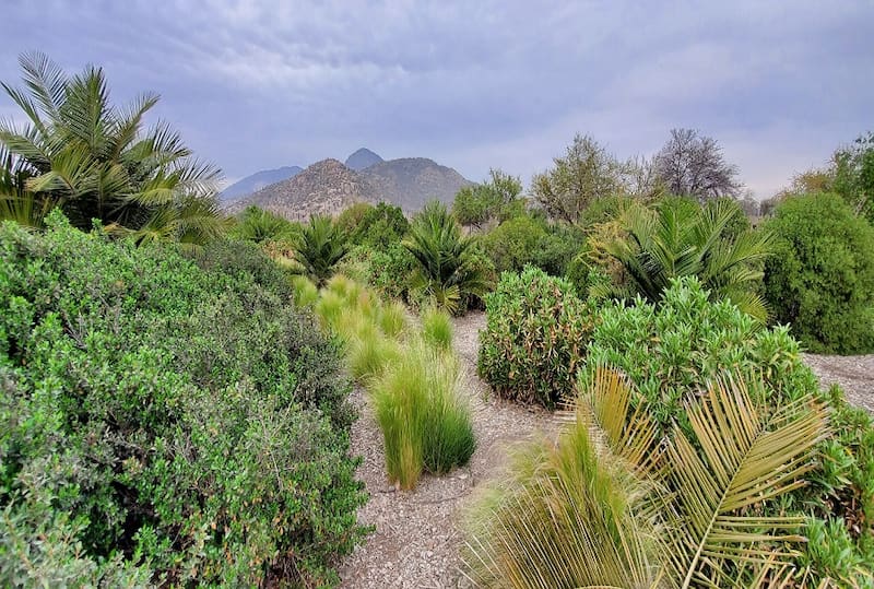 Son más de 200 especies de flora nativa y endémica, las que se dividen en cuatro ecosistemas vegetales: matorral esclerófilo (de hojas pequeñas y duras), matorral espinoso, bosque espinoso y bosque esclerófilo, y entre las que están el boldo, el litre, el maitén, el molle, el quillay, el algarrobo, el espino, la añañuca y la palma, que están repartidos por sus 4,5 hectáreas.